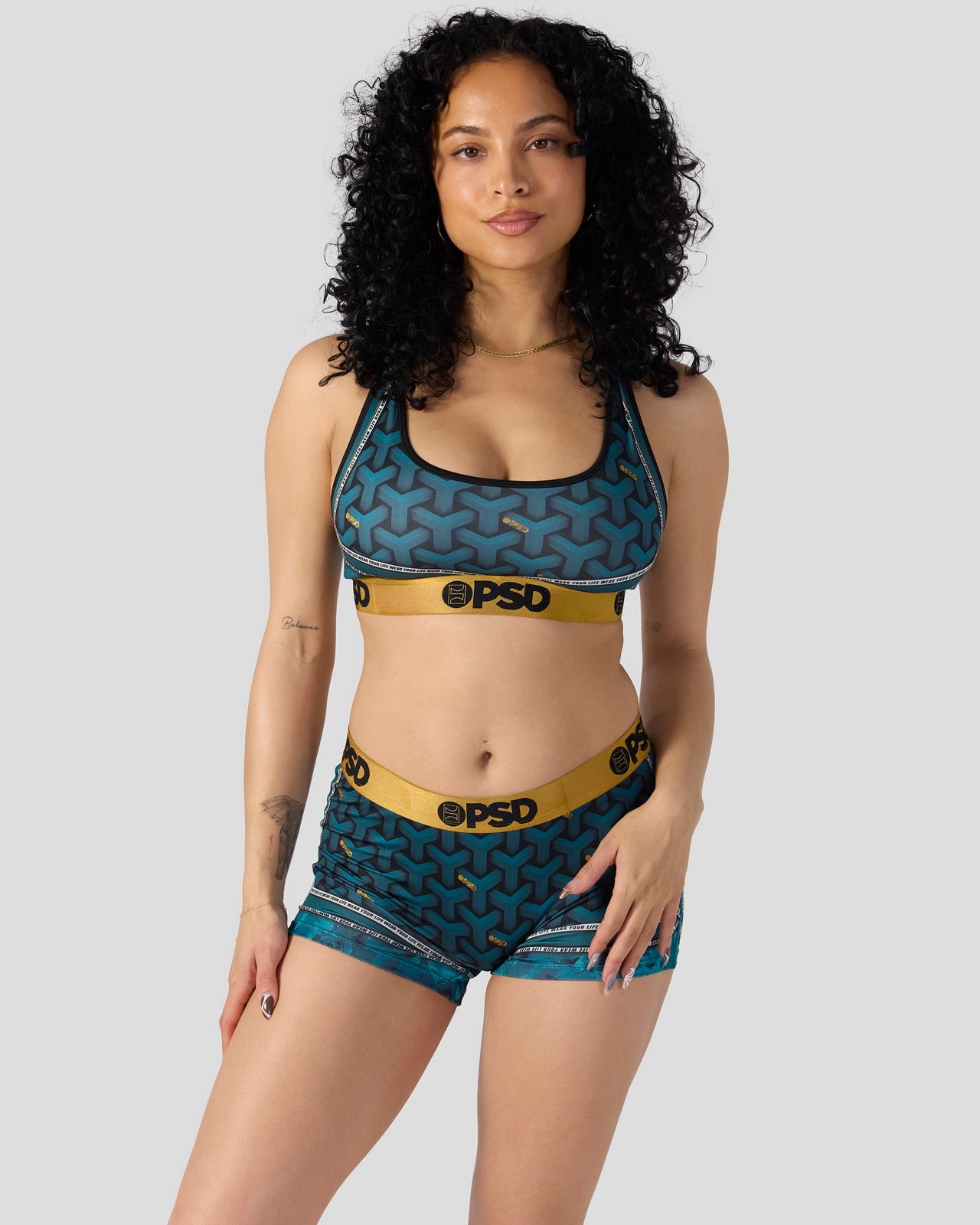 Make a statement in this luxury-inspired print. The Baller Lux Teal Sports Bra is made from a silky poly blend with a comfortable full coverage. keep-you-in fit. The PSD Sports Bras are perfect for everyday wear and working out.