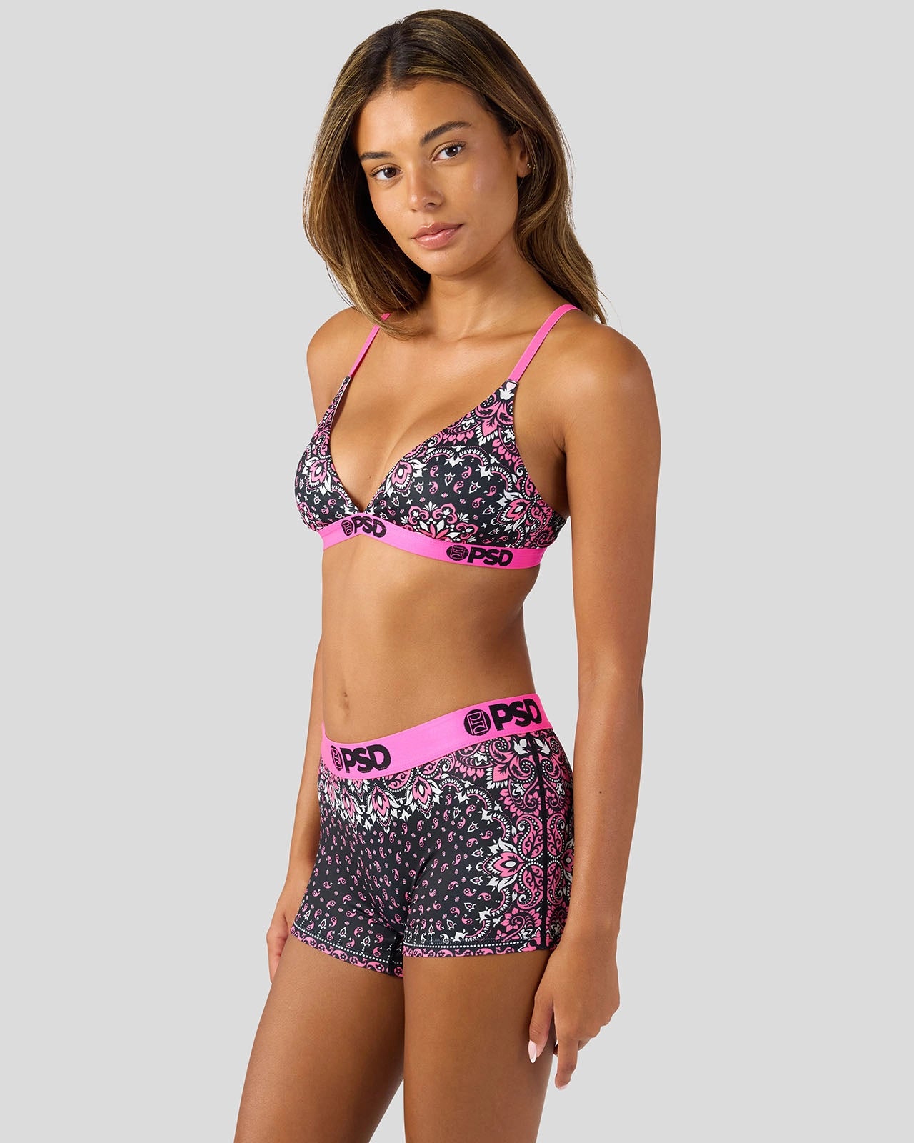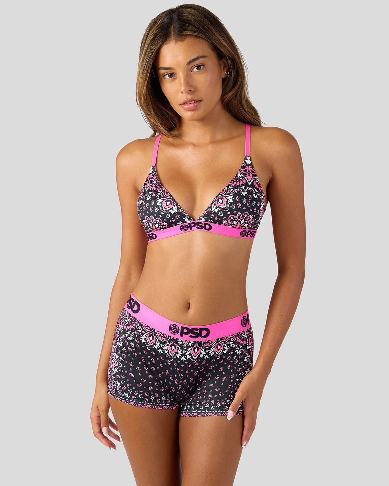 A femme take on a bandana print. the Bandarama Boy Short is made from a silky poly blend with a comfortable full-coverage. keep-you-in fit. The PSD boy shorts are perfect for everyday wear and working out.