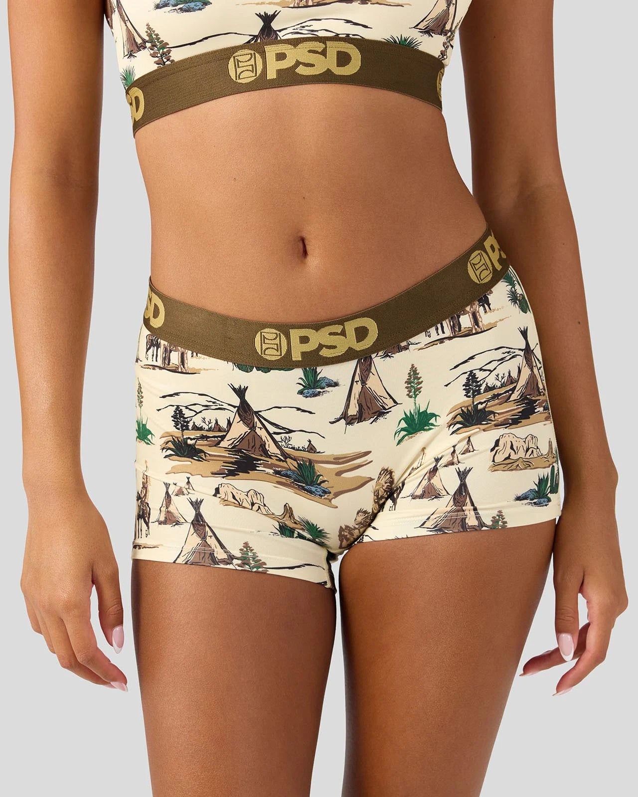 Heritage meets heat. Featuring a Comanche print. the Vintage Boy Short from Hooey x PSD is made from a silky poly blend with a comfortable full-coverage. keep-you-in fit. The PSD boy shorts are perfect for everyday wear and working out.