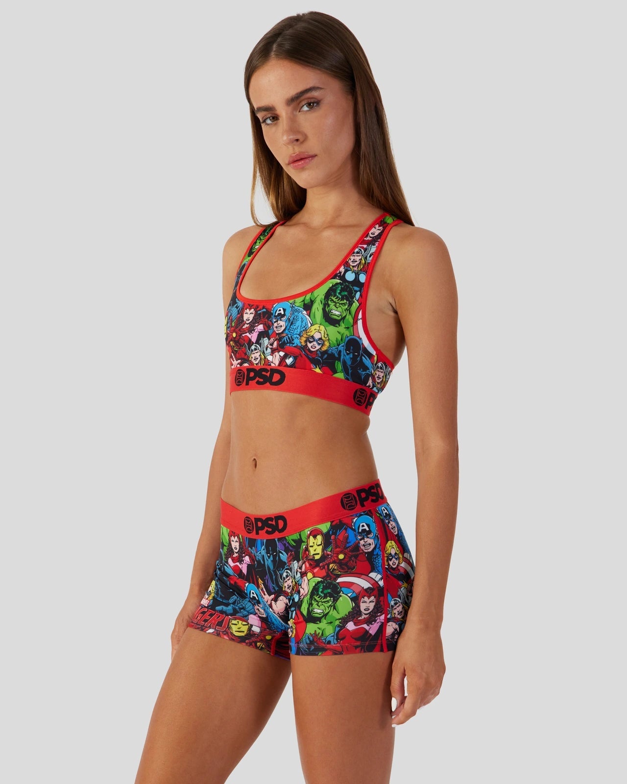 The Marvel – Avengers Boyshort features characters from the Marvel comics assembled in an all-over print on the boxer brief that includes Captain America. Black Panther. The Incredible Hulk. Iron Man. Thor. Scarlet Witch. and Captain Marvel. Made of our silky poly blend with a comfortable full coverage. keep-you-in fit. the Marvel Avengers Underwear or Boy Short is perfect for everyday wear and working out.
