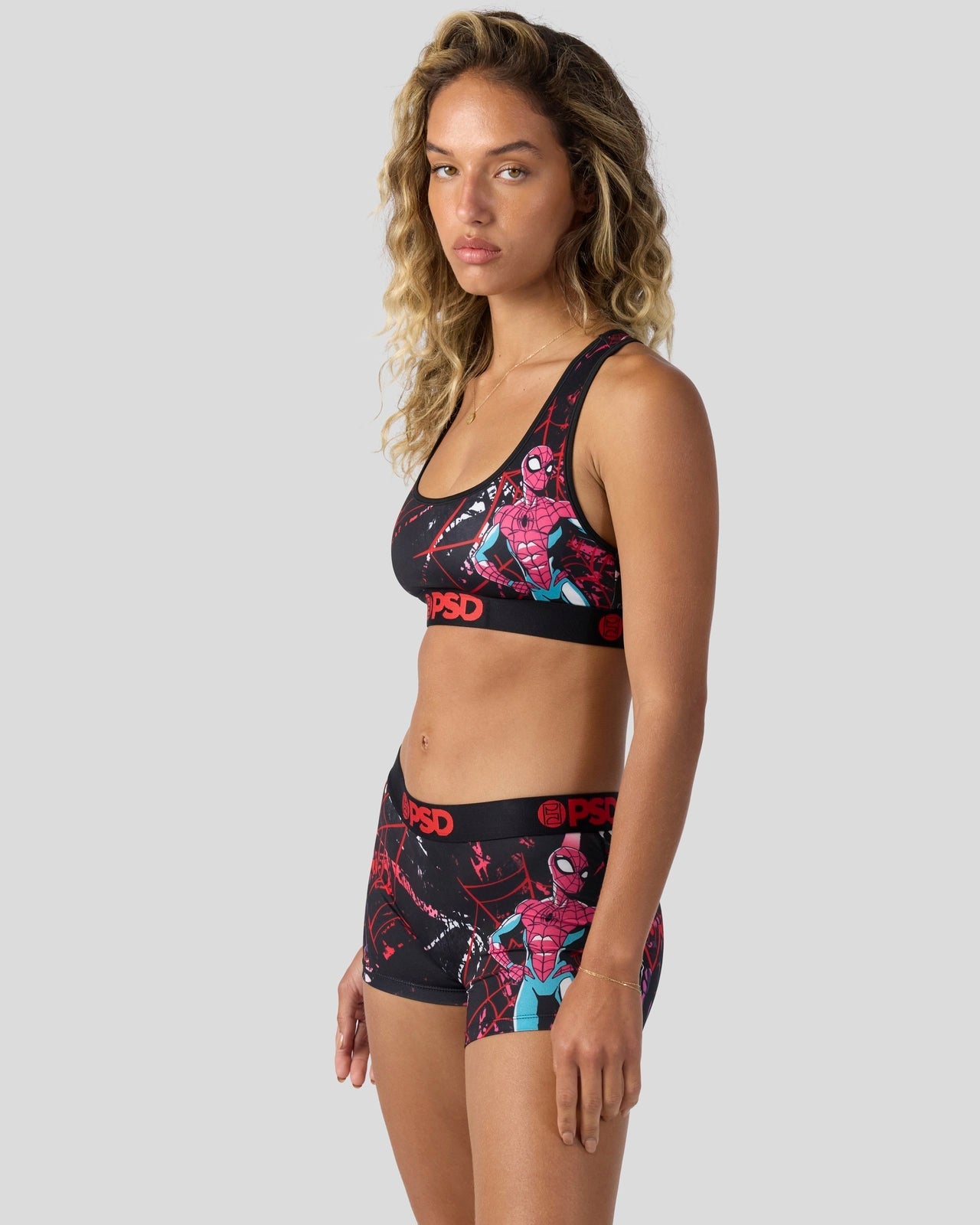 You’re not seeing double. Swing into new with this new Marvel pair featuring the spider duo. The Spider Bros Boy Short is made from a silky poly blend with a comfortable full coverage. keep-you-in fit. The PSD boy shorts are perfect for everyday wear and working out.