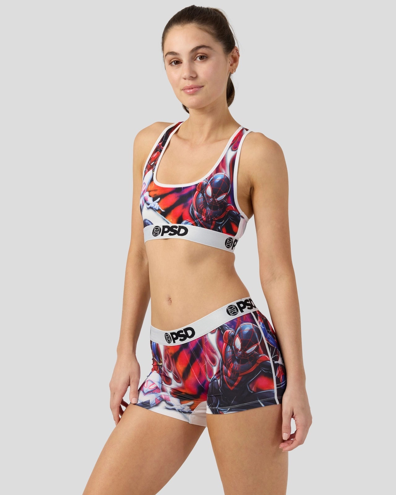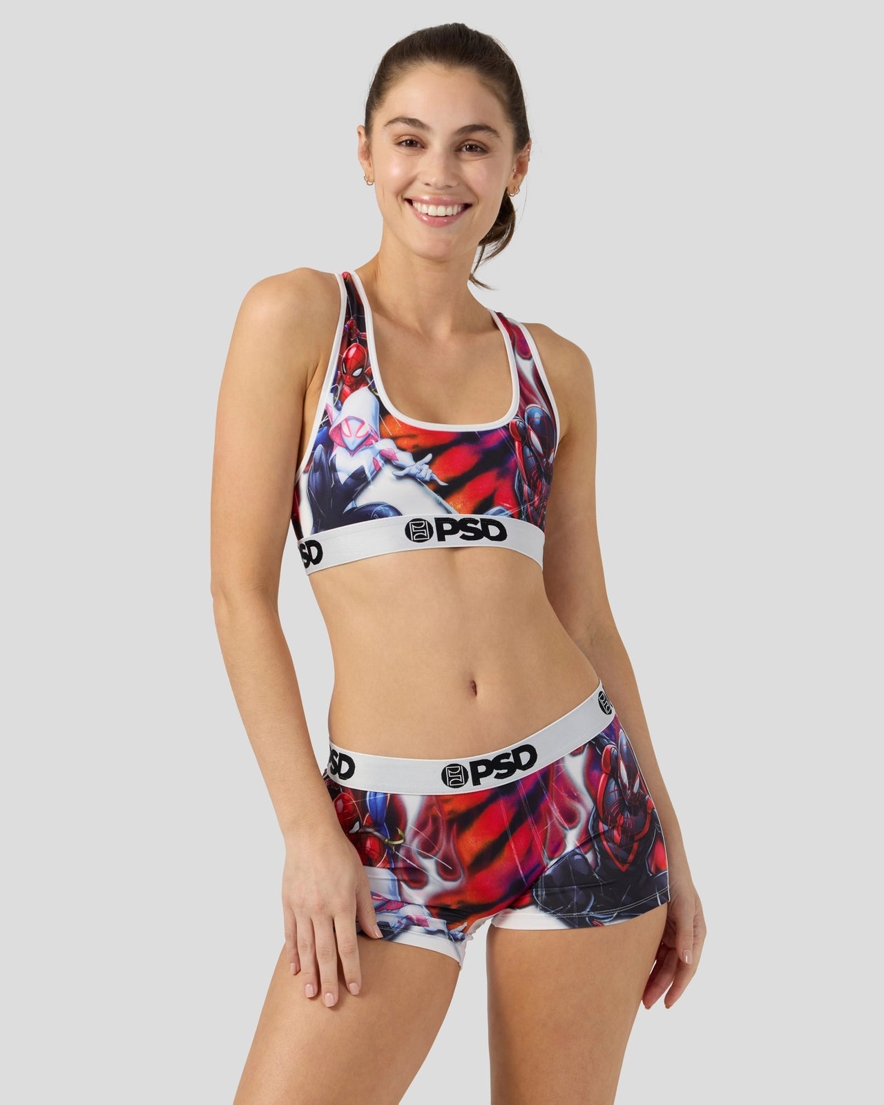 The whole Spidey crew came together for this new Marvel pair. The Spider-Man Triad Boy Short is made from a silky poly blend with a comfortable full coverage. keep-you-in fit. The PSD boy shorts are perfect for everyday wear and working out.