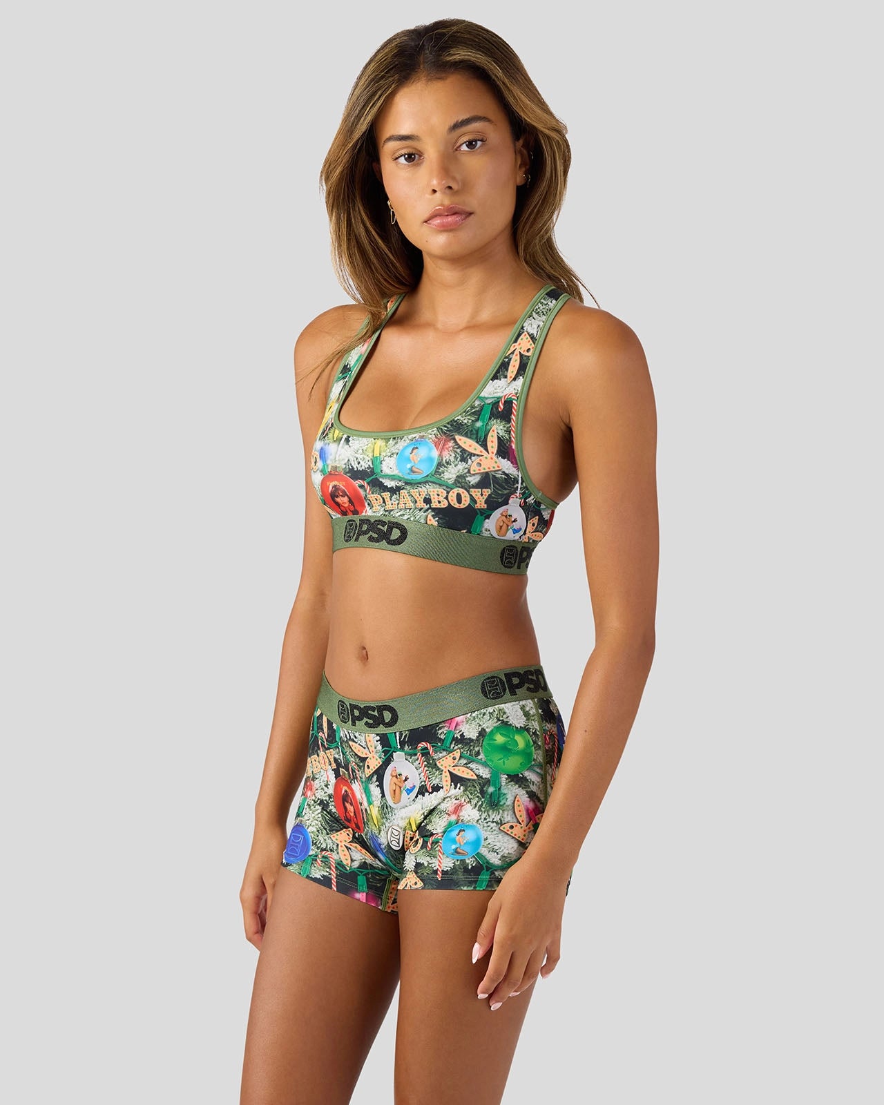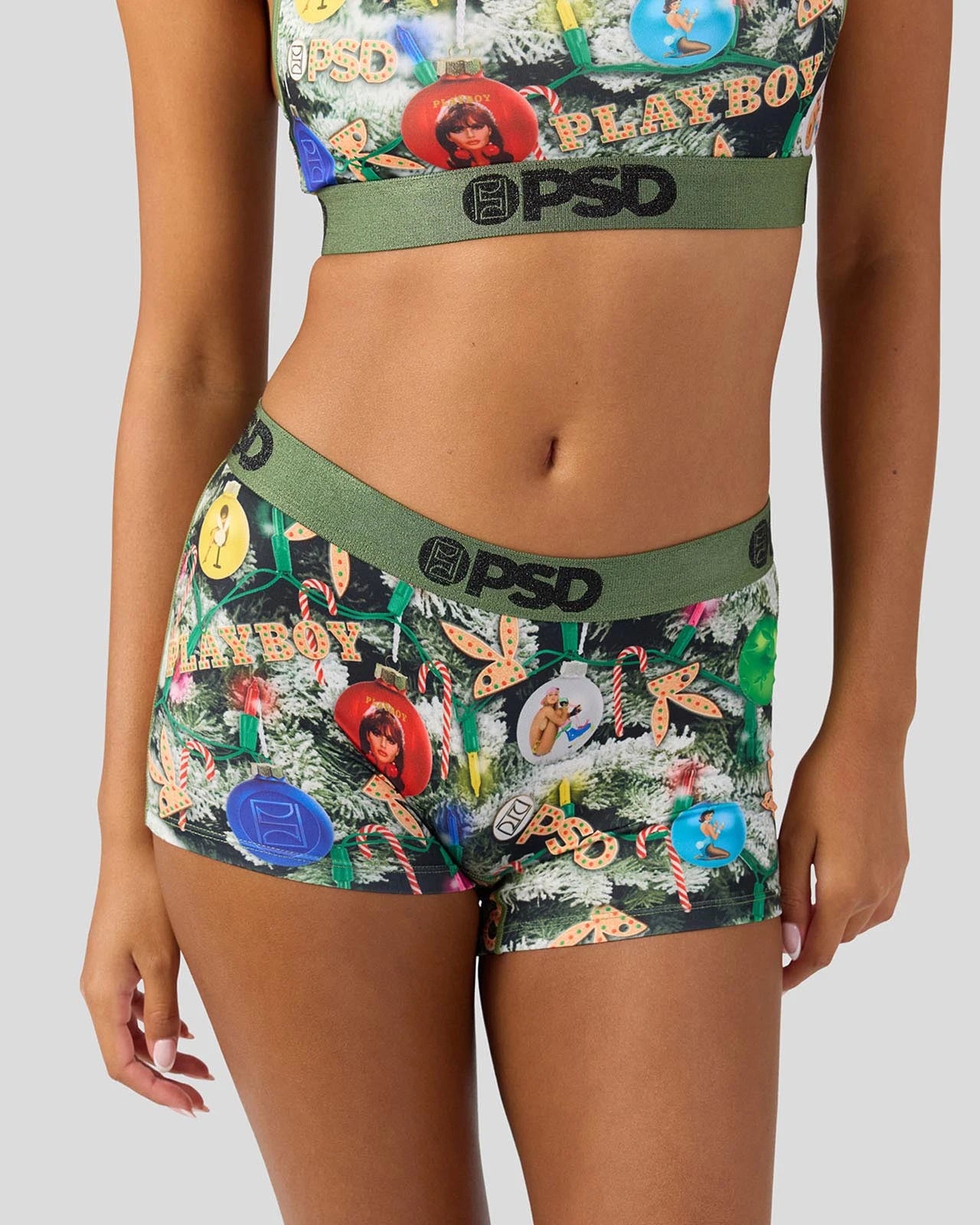 Deck the halls with playmates and PSD. The Festive Tree Boy Short from Playboy is made from a silky poly blend with a comfortable full-coverage. keep-you-in fit. The PSD boy shorts are perfect for everyday wear and working out.