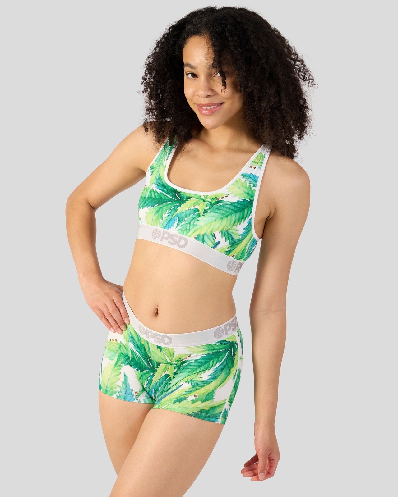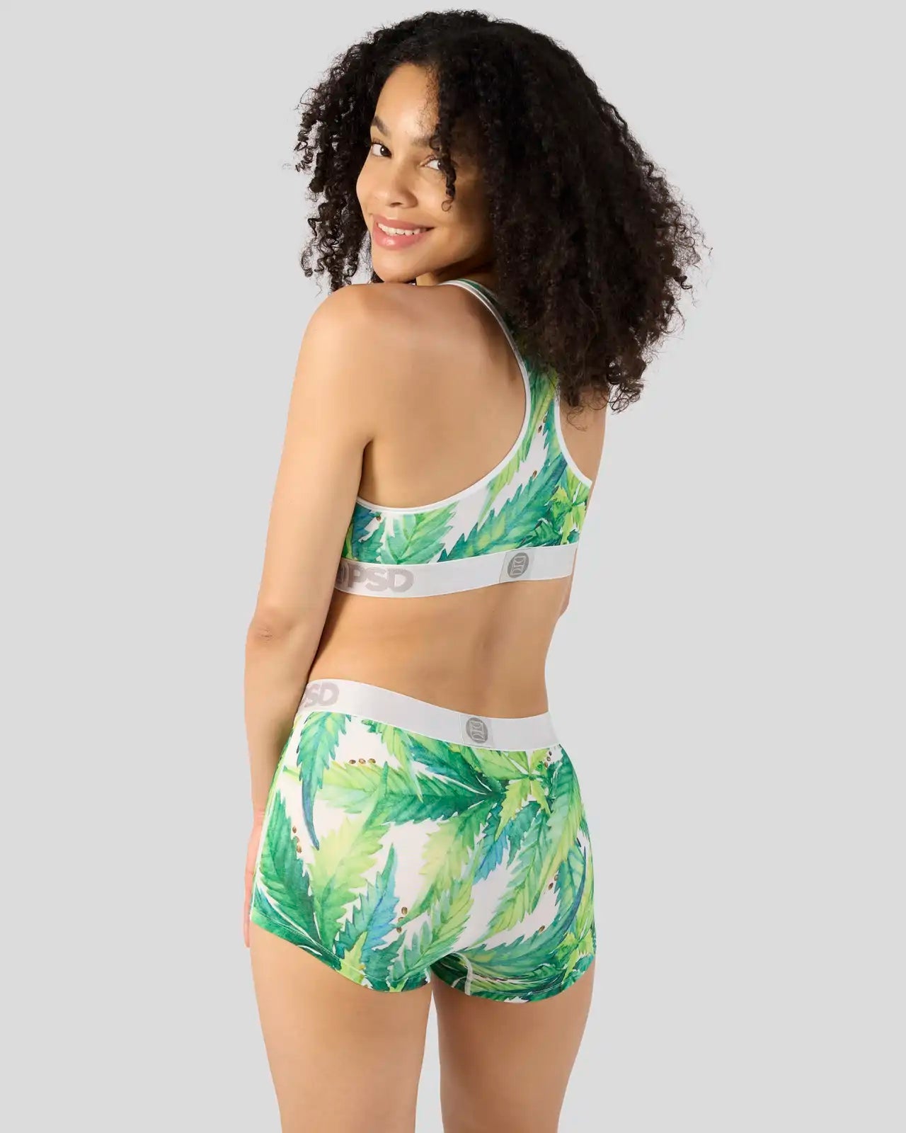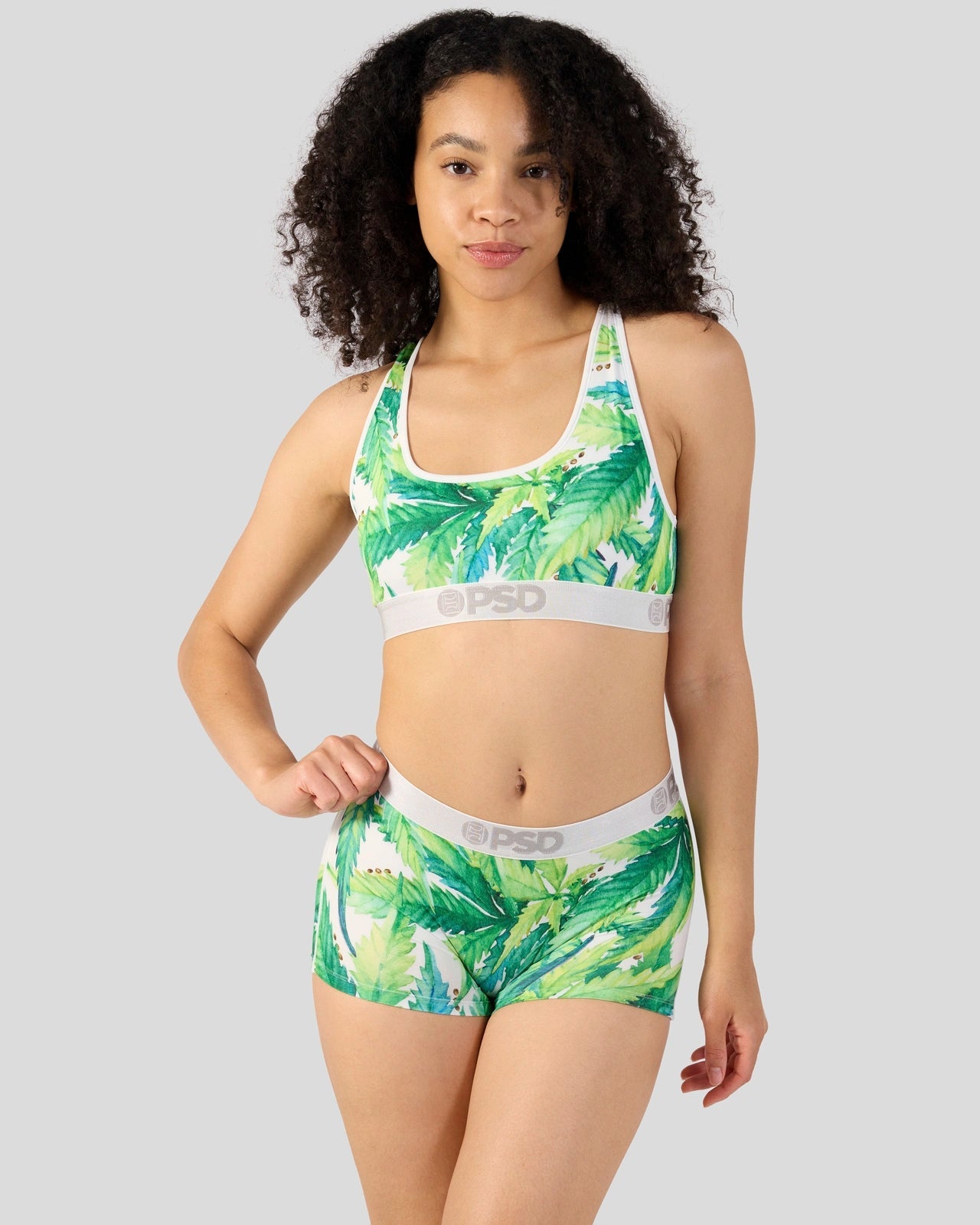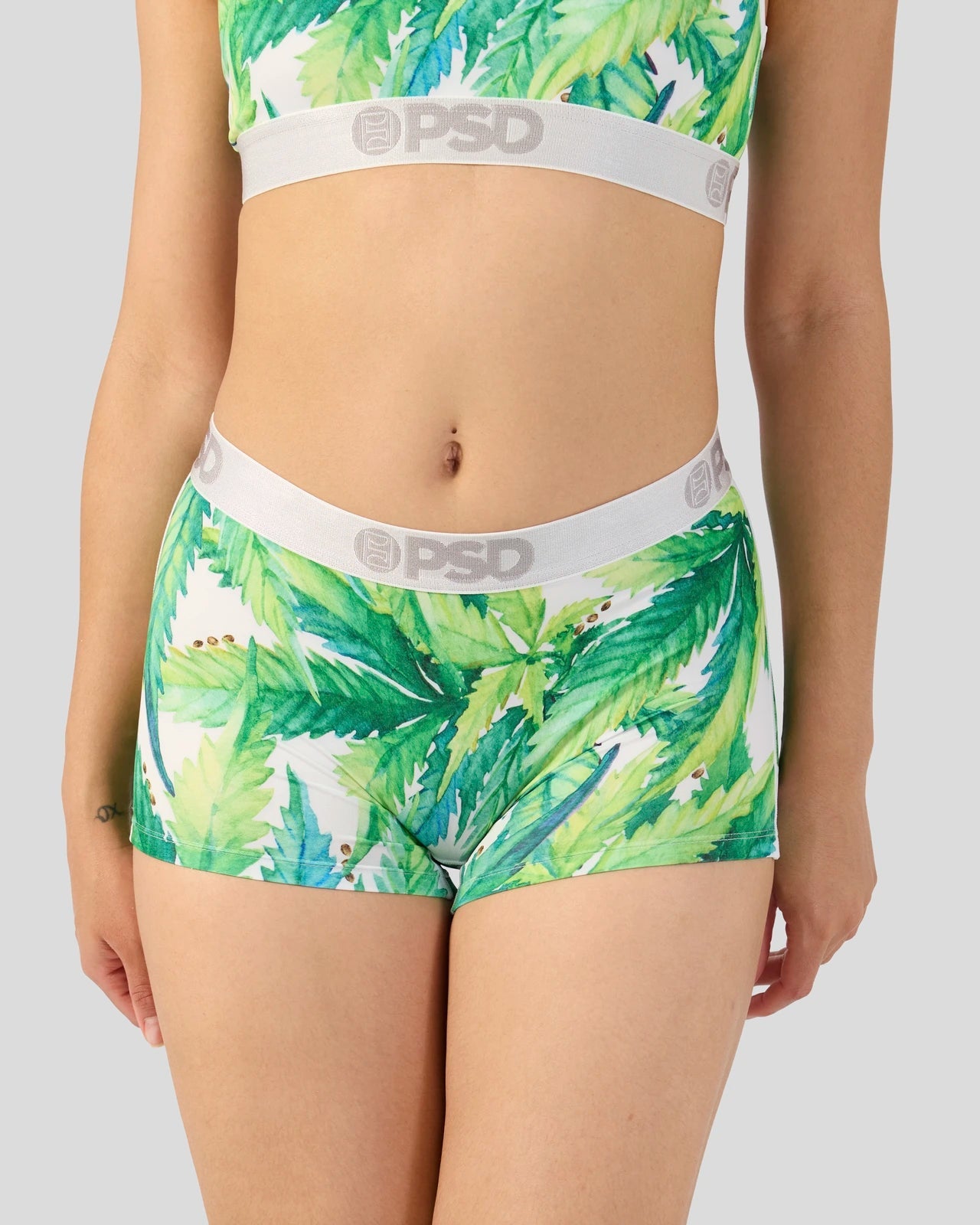 Stay lit in this greens-printed women’s pair. The Seeds and Stems Boy Short is made from a silky poly blend with a comfortable full coverage. keep-you-in fit. The PSD boy shorts are perfect for everyday wear and working out.