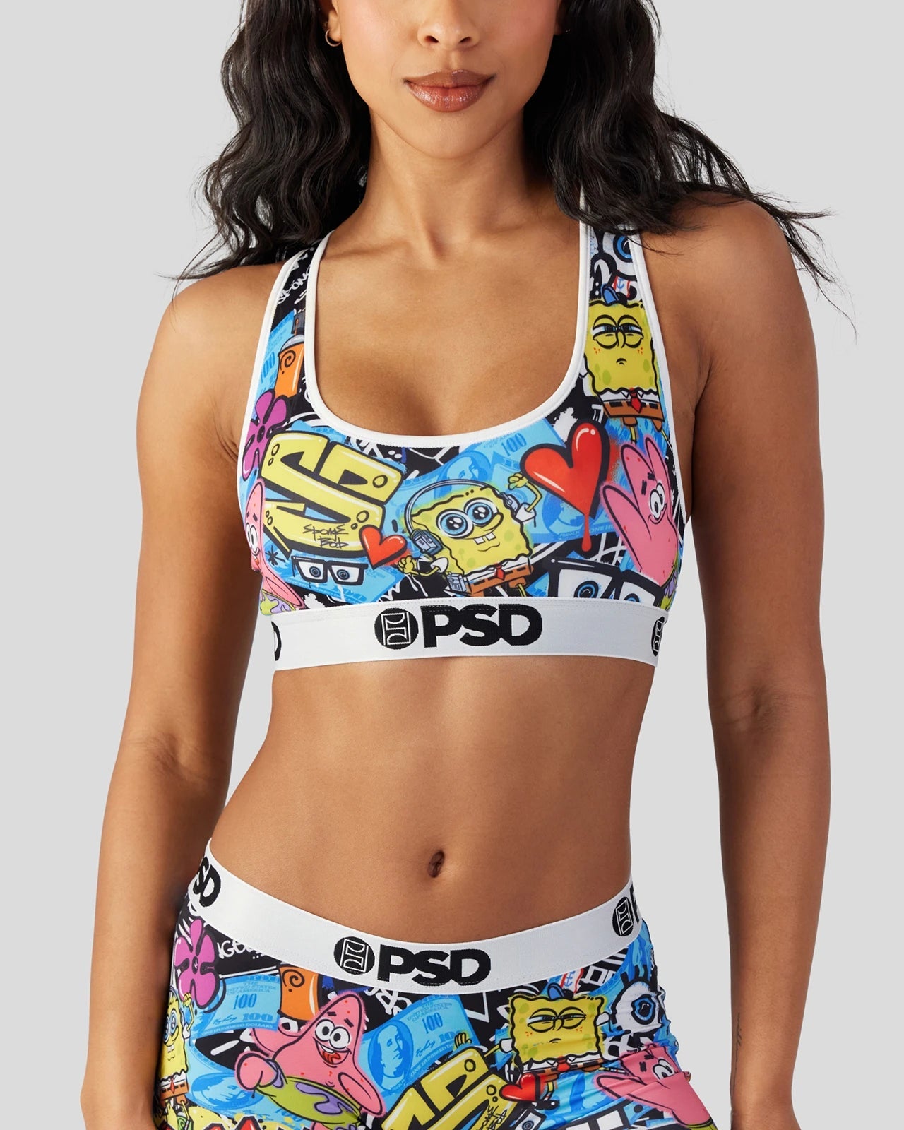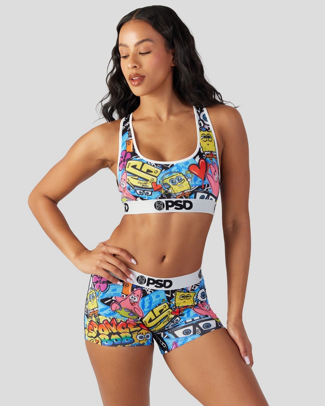 Hit the streets in the latest from SpongeBob SquarePants x PSD. The Street Sports Bra is made from a silky poly blend with a comfortable full coverage. keep-you-in fit. The PSD boy shorts are perfect for everyday wear and working out.