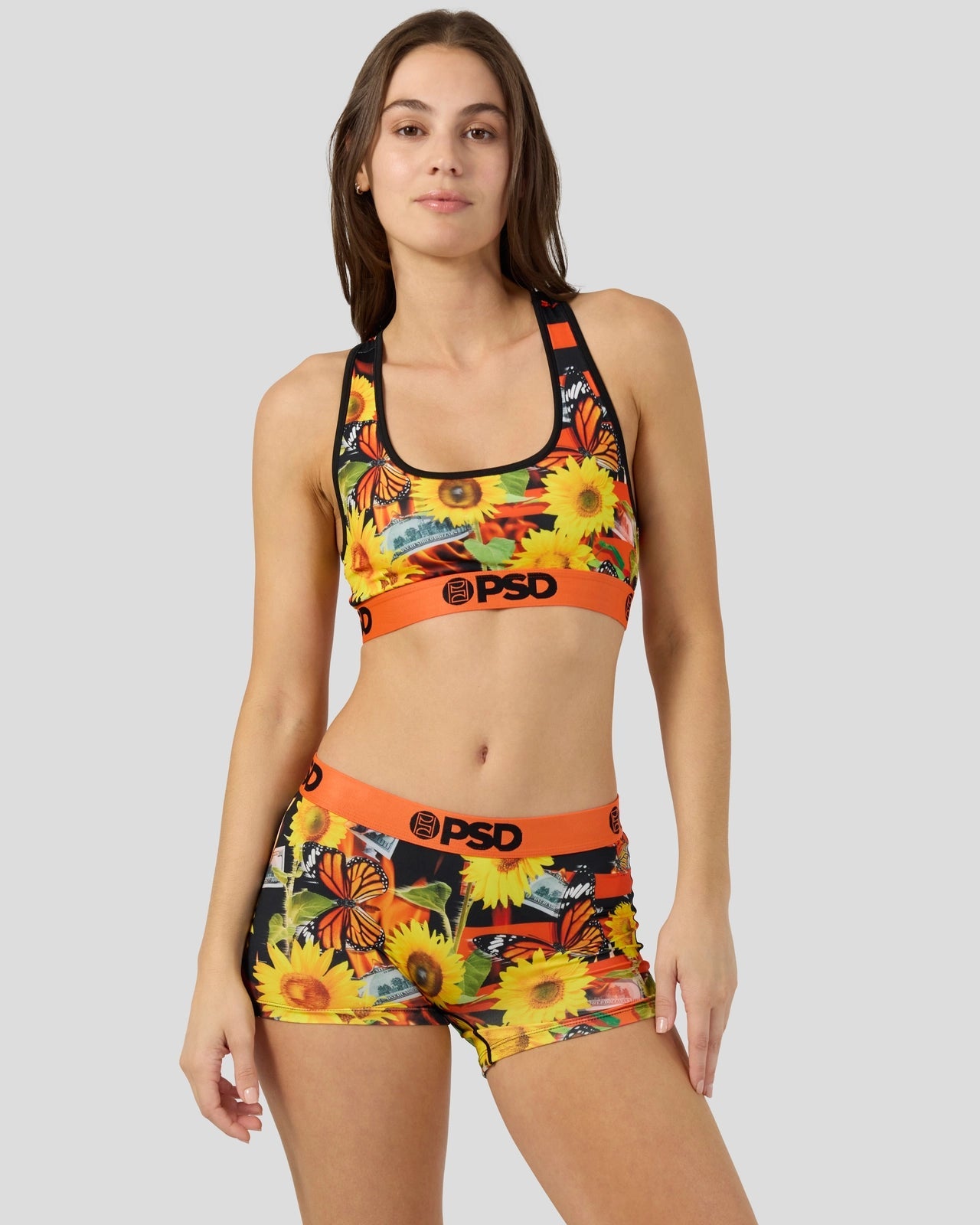 Our newest floral print is on fire. The Sunfire Split Sports Bra is made from a silky poly blend and is breathable yet slightly compressive. bringing you the comfort and support you need for everything you get into.