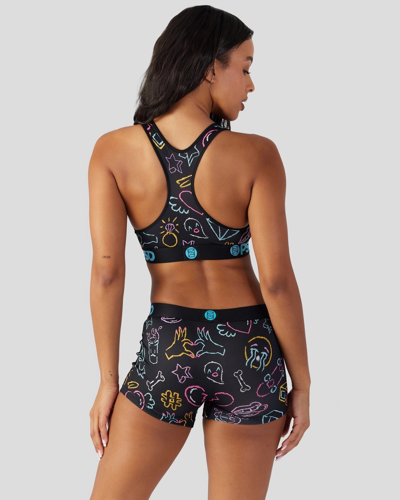 Introducing the latest Warface look to join the collection. Featuring our signature Warface alongside neon-colored doodles. the Warface Scribe Sports Bra is made from a silky poly blend with a comfortable full coverage. keep-you-in fit. The PSD boy shorts are perfect for everyday wear and working out.
