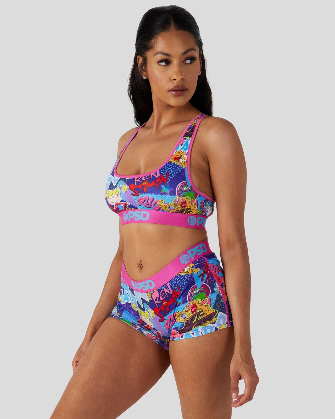 Bring back the good old days when cartoons were at their peak in this bra that features your favorite characters from Rugrats. CatDog. and Ren & Stimpy. Made from a silky poly blend. this the ’90s Miami Sports Bra is breathable yet slightly compressive. bringing you the comfort and support you need for everything you get into.