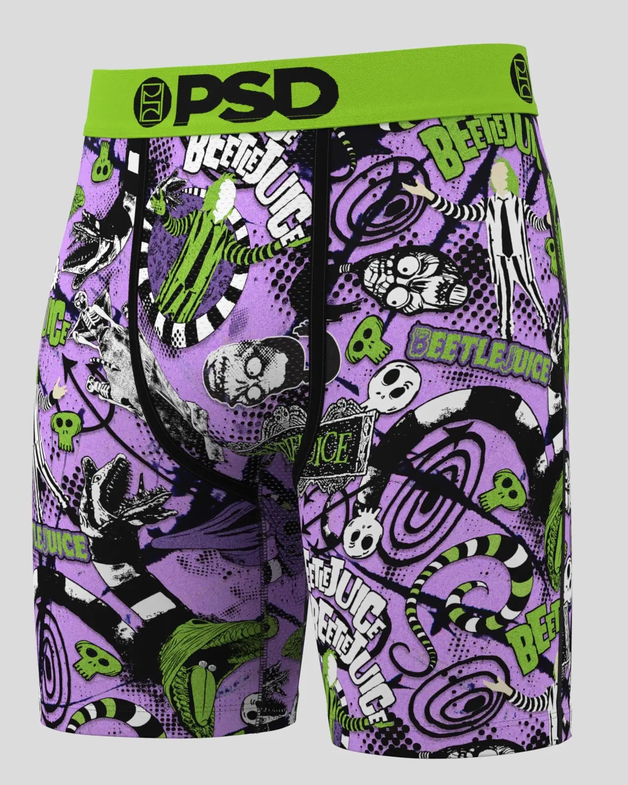 It’s showtime. The ghost with the most is back and ready to crash the Halloween party. The Beetlejuice x PSD briefs include our ultra-comfortable Signature WaistBand. a breathable MicroMesh pouch. and four-way stretch. The PSD 7 Standard Length Briefs won’t roll or ride and were built for everything. from everyday wear to your toughest workouts.