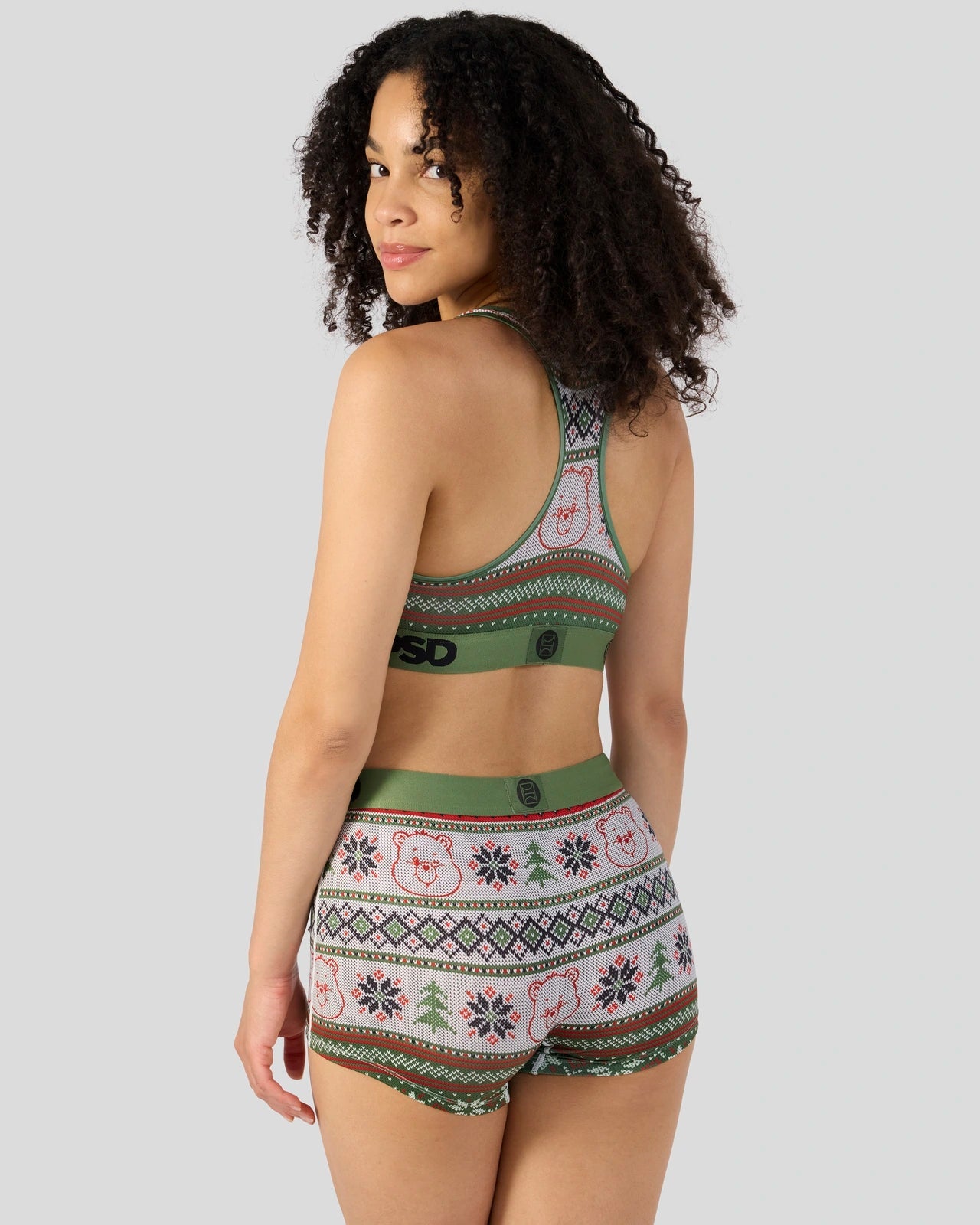 The holidays with a Care Bear twist. The Ugly Sweater Sports Bra from the Care Bears x PSD is made from a silky poly blend and is breathable yet slightly compressive. bringing you the comfort and support you need for everything you get into.