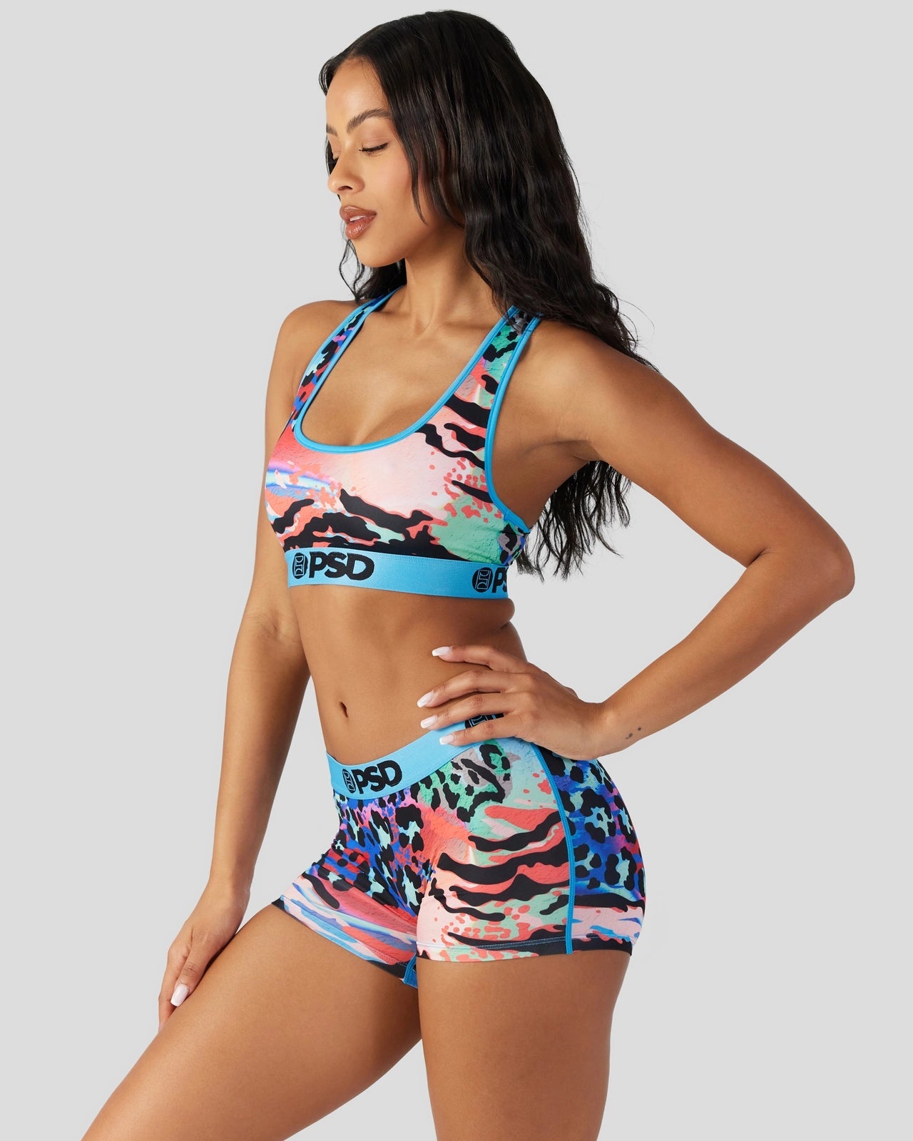 Make a wild statement in our new multi-animal print style. The Feral Sports Bra is made from a silky poly blend with a comfortable full coverage. keep-you-in fit. The PSD boy shorts are perfect for everyday wear and working out.