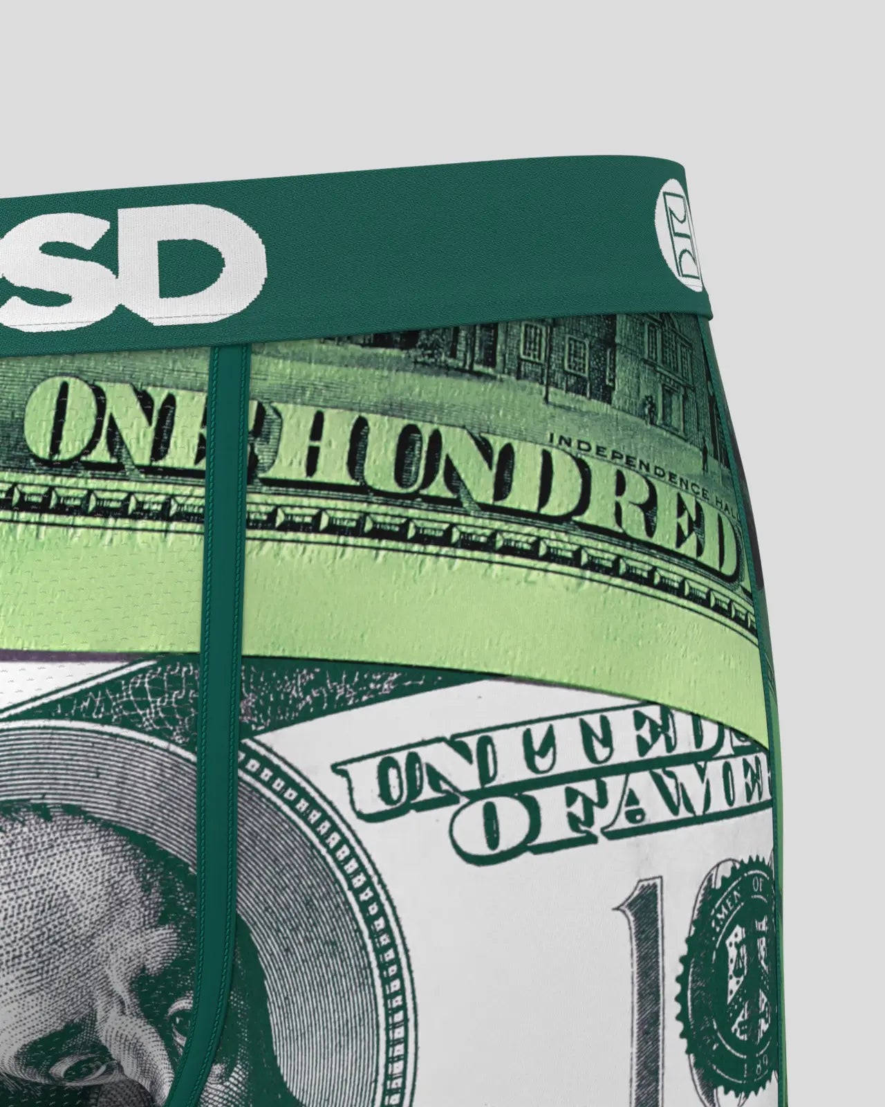 Go big with the Benjamins. With its oversized $100 bills. there’s nothing subtle about this pair. The Green Bens briefs include our ultra-comfortable Signature WaistBand. a breathable MicroMesh pouch. and four-way stretch. The PSD 7 Standard Length Briefs won’t roll or ride and were built for everything. from everyday wear to your toughest workouts.