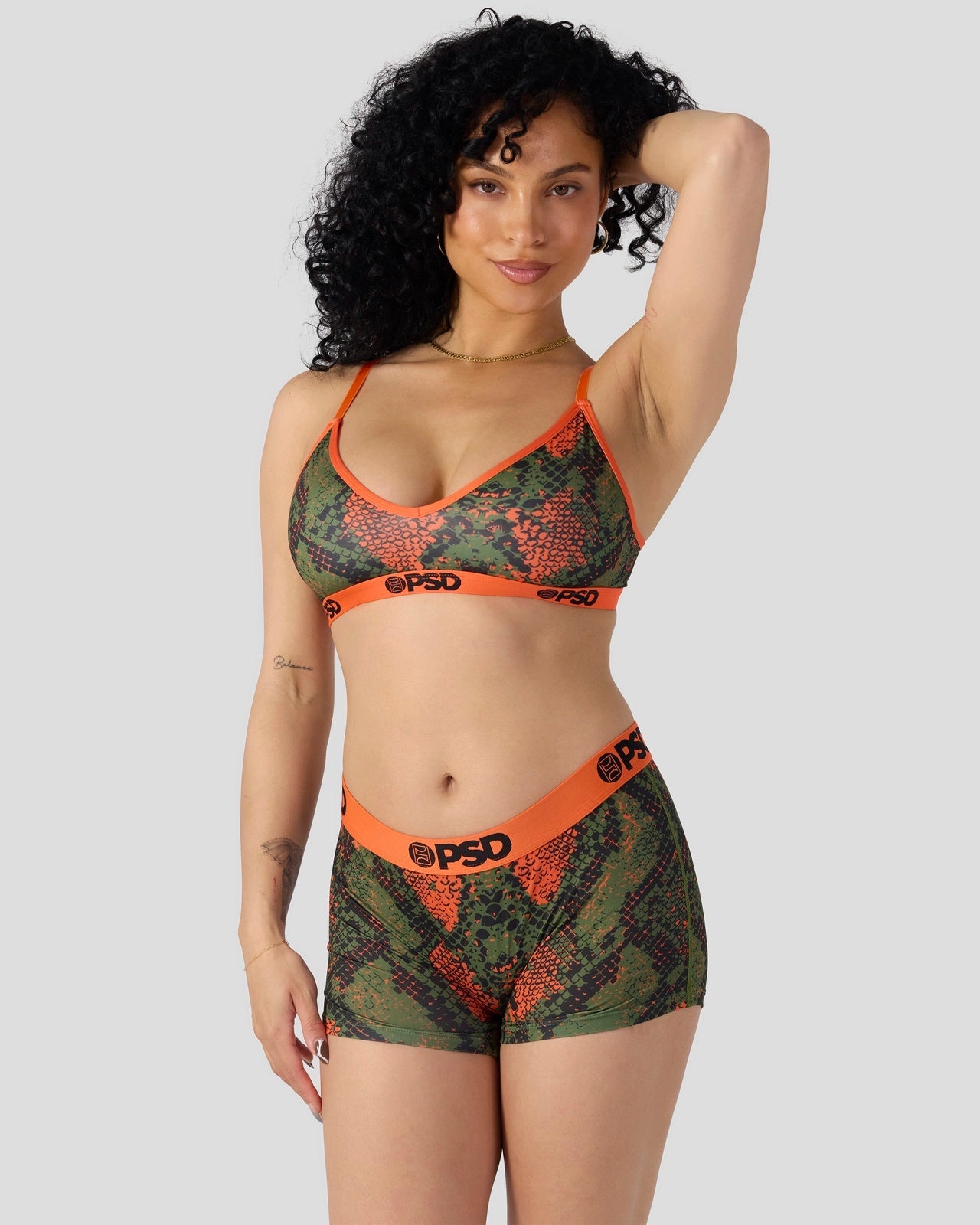 Slither your way into this new snakeskin-inspired look. The Green Snake Boy Short is made from a silky poly blend with a comfortable full coverage. keep-you-in fit. The PSD boy shorts are perfect for everyday wear and working out.