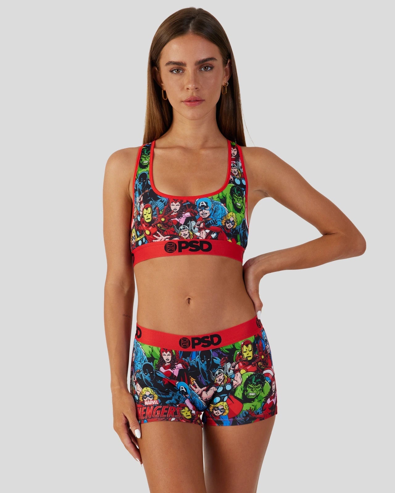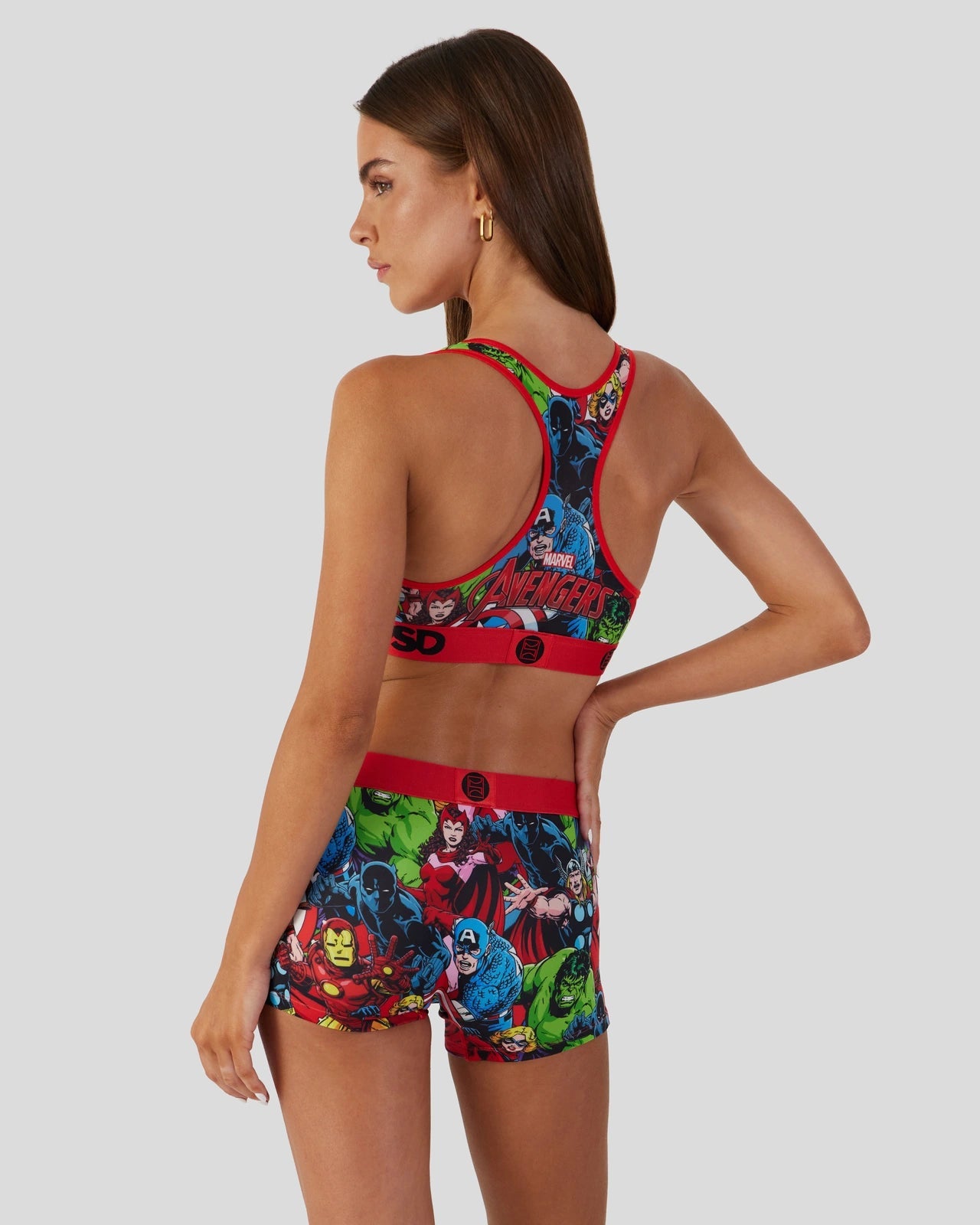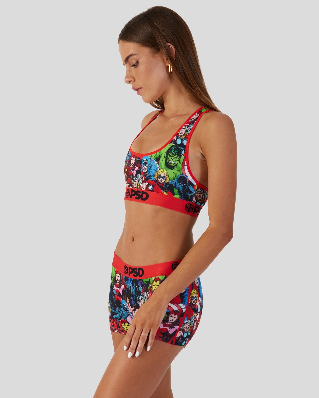 The Marvel – Avengers Sports Bra features members of the Avengers from the Marvel comics assembled in an all-over print that includes Captain America. Black Panther. Iron Man. Thor. Scarlet Witch. and Captain Marvel. Made with our silky poly blend. the Sports Bra is breathable yet slightly compressive. bringing you the comfort and support you need for everything you love to do in life.