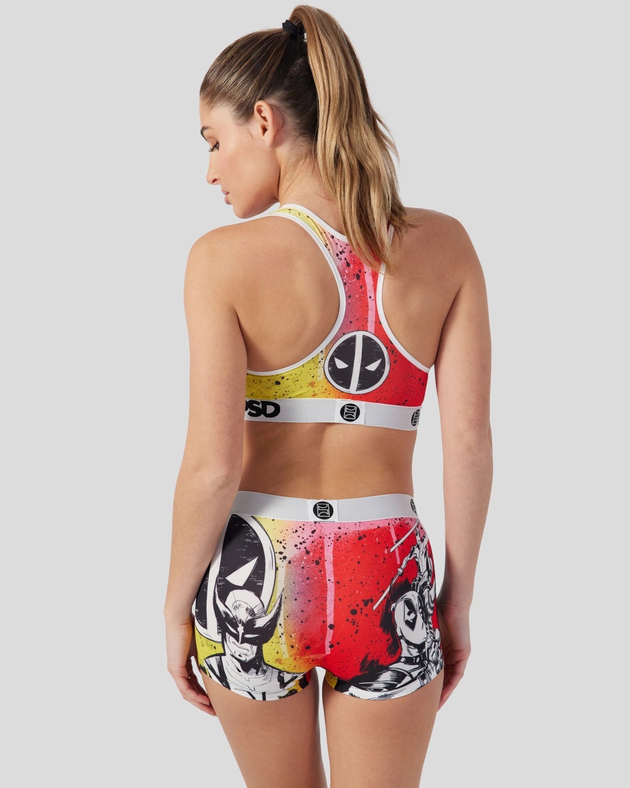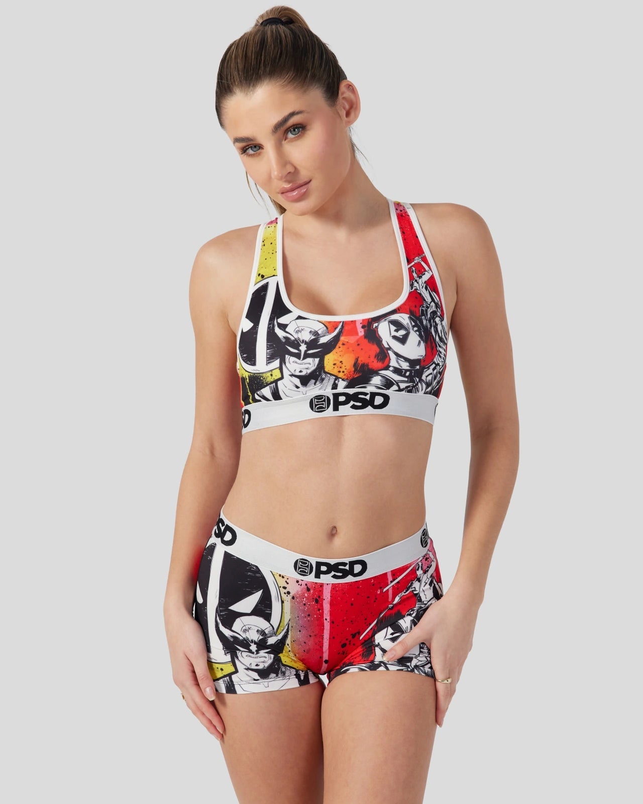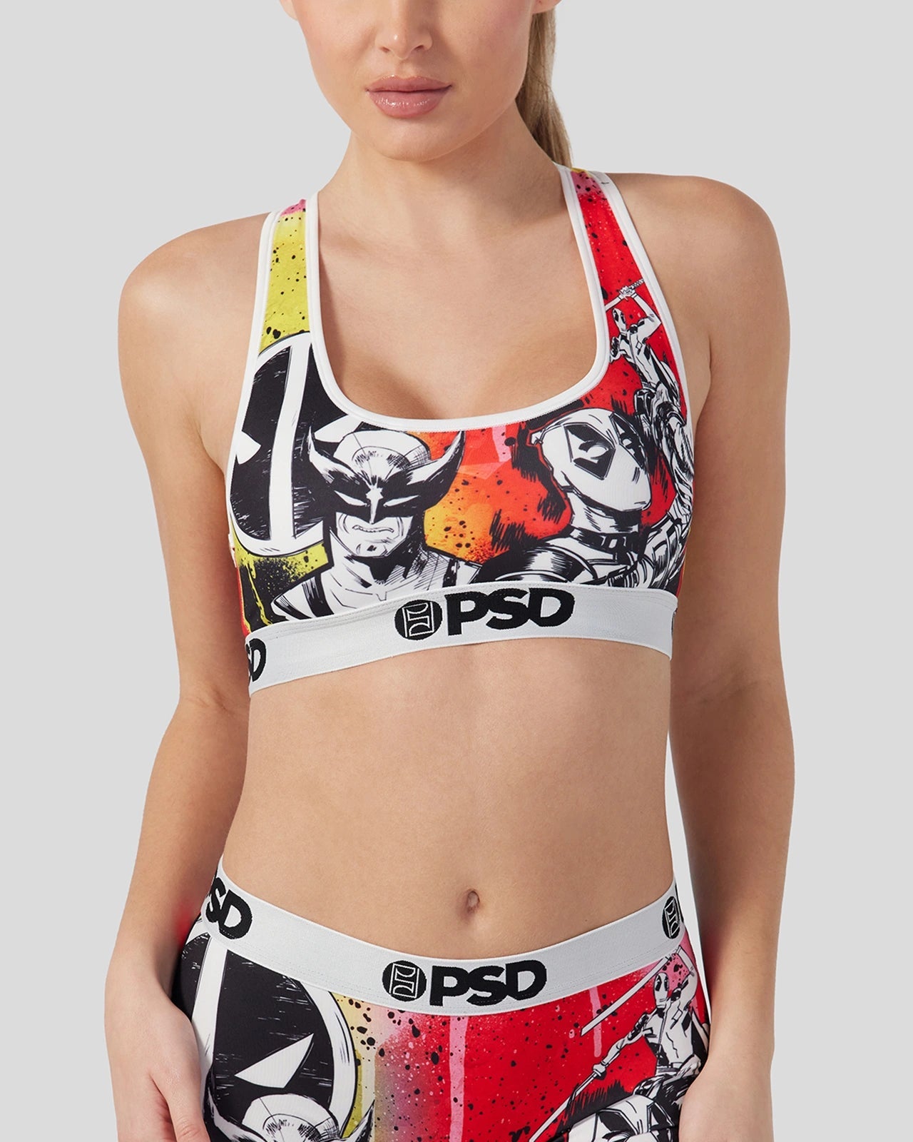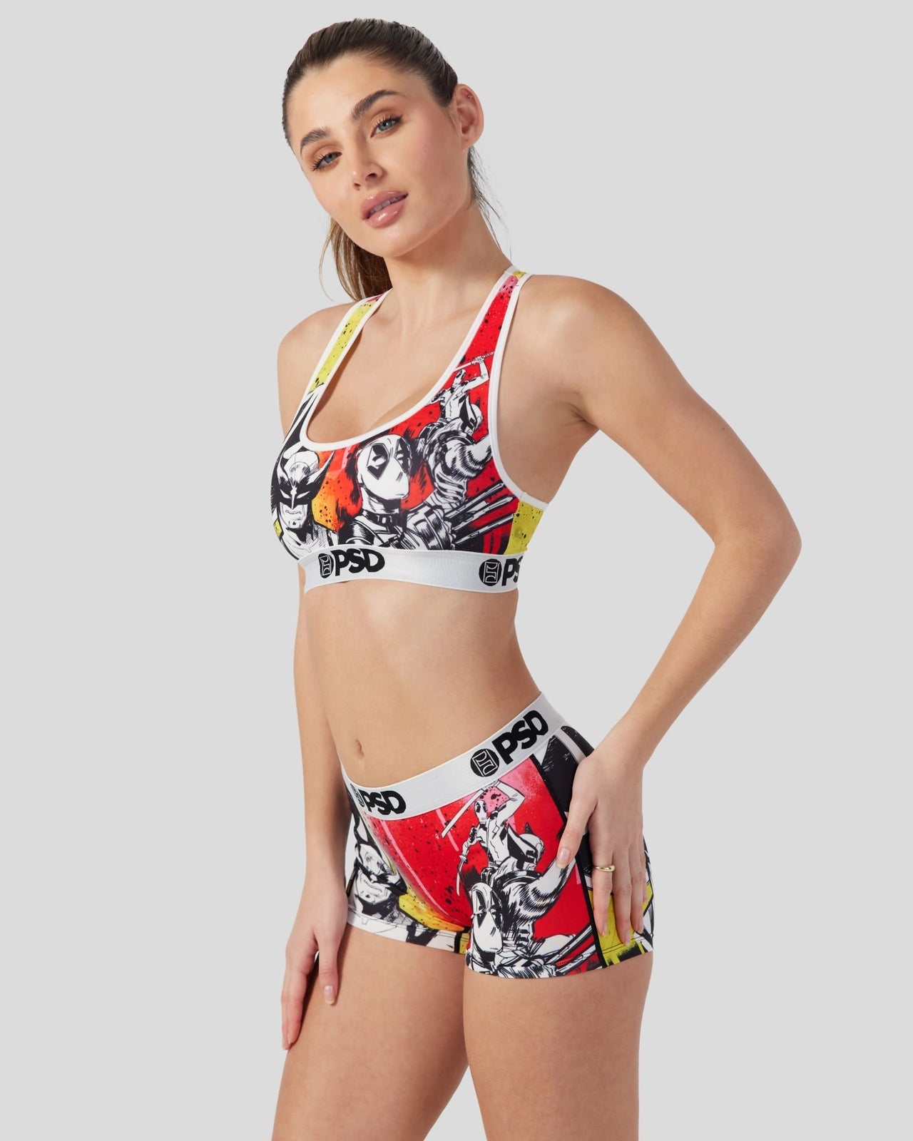 New from Deadpool & Wolverine. Inspired by classic comics. the Holy Snikt! Sports Bra is made from a silky poly blend with a comfortable full coverage. keep-you-in fit. The PSD boy shorts are perfect for everyday wear and working out.
