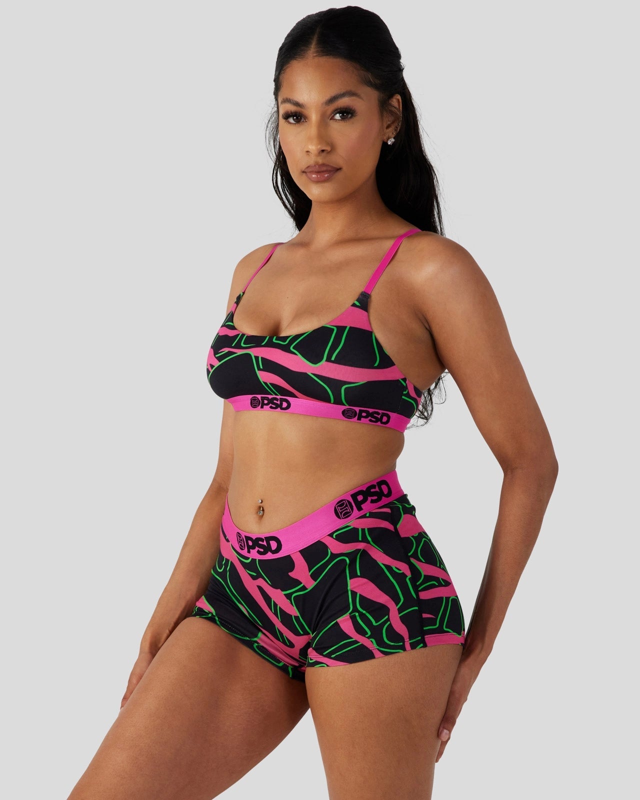 Our newest animal print is here and it’s a wild one. Featuring a giraffe-inspired print in a neon hue. the Neon Giraffe Scoop Bra is made of super soft Modal and almost feels like you’re not wearing a bra at all. It’s fully lined and features include adjustable straps. a cute scoop neckline. and a soft microfiber band that won’t ride or rub.