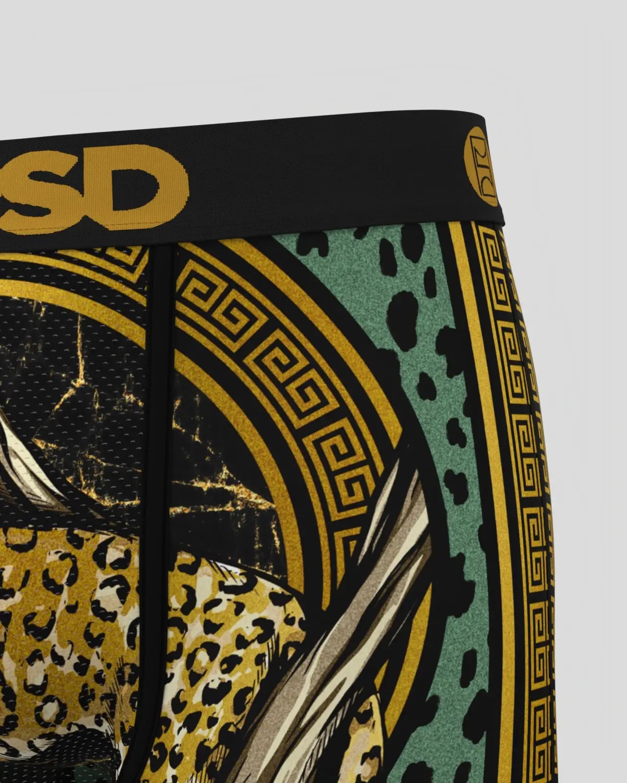 With a luxury-inspired design and metallic waistband. the Rich Jaguar briefs include our ultra-comfortable Signature WaistBand. a breathable MicroMesh pouch. and four-way stretch. The PSD 7 Standard Length Briefs won’t roll or ride and were built for everything. from everyday wear to your toughest workouts.