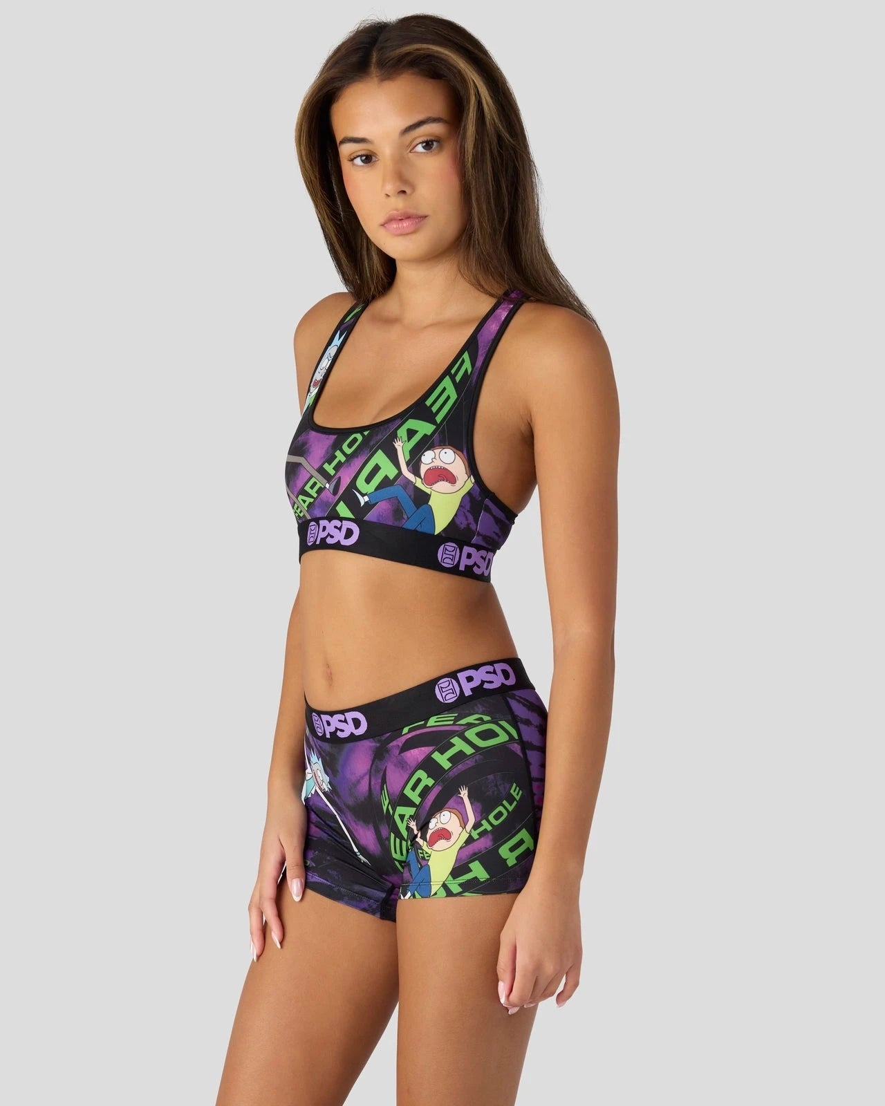 Slip into another dimension with this new drop from Rick and Morty x PSD. The Fear Hole Sports Bra is made from a silky poly blend and is breathable yet slightly compressive. bringing you the comfort and support you need for everything you get into.