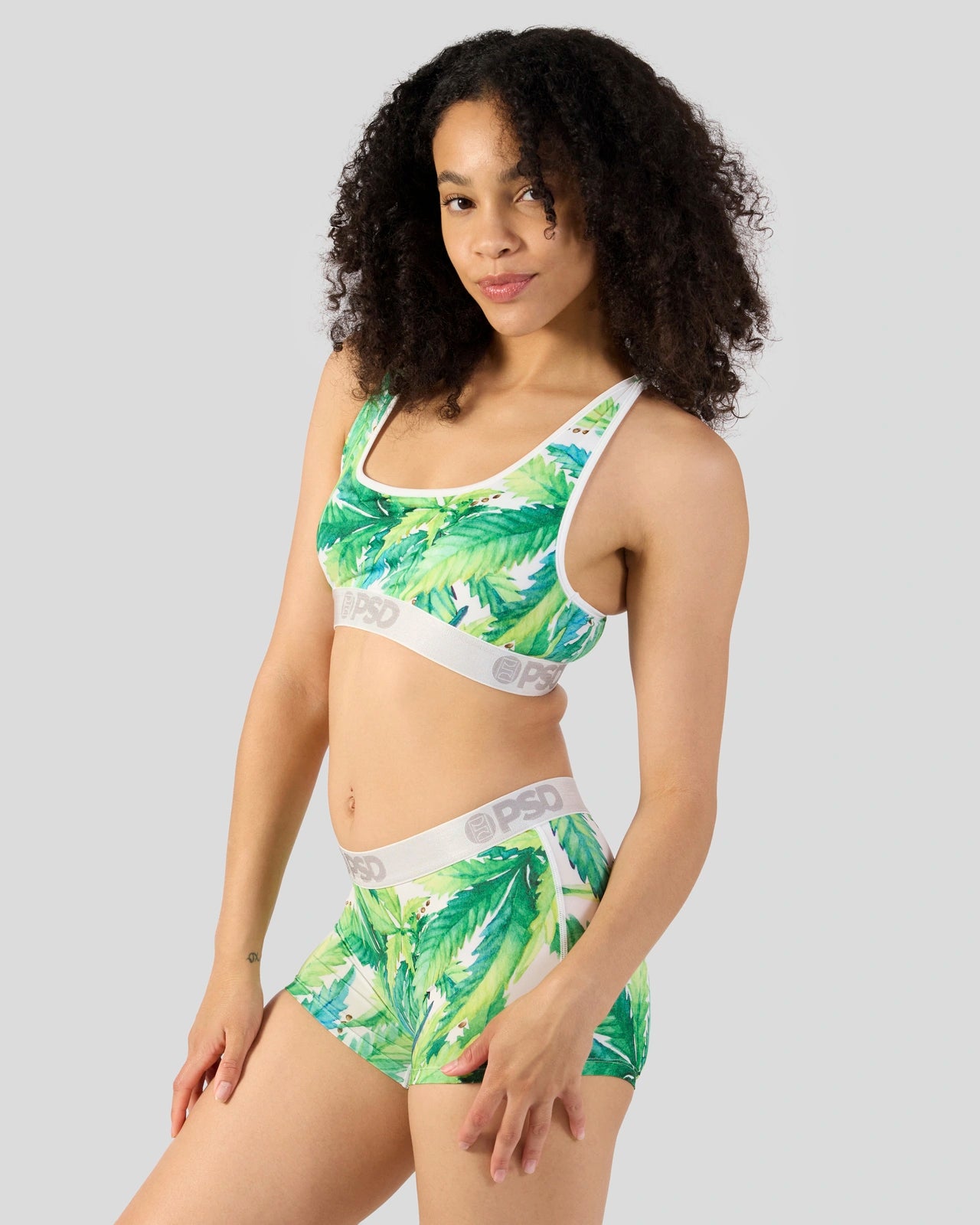 Stay lit in this greens-printed women’s bra. The Seeds and Stems Sports Bra is made from a silky poly blend and is breathable yet slightly compressive. bringing you the comfort and support you need for everything you get into.