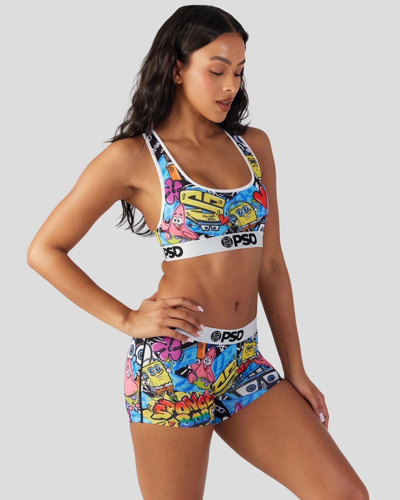 Hit the streets in the latest from SpongeBob SquarePants x PSD. The Street Sports Bra is made from a silky poly blend with a comfortable full coverage. keep-you-in fit. The PSD boy shorts are perfect for everyday wear and working out.