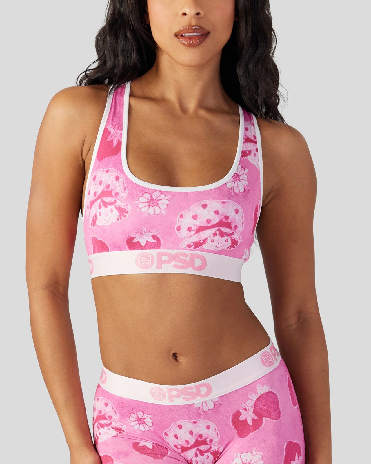 The newest look from Strawberry Shortcake x PSD is like an early-2000s tracksuit throwback. Featuring a textured-looking print. the Velour Sports Bra is made from a silky poly blend with a comfortable full coverage. keep-you-in fit. The PSD boy shorts are perfect for everyday wear and working out.