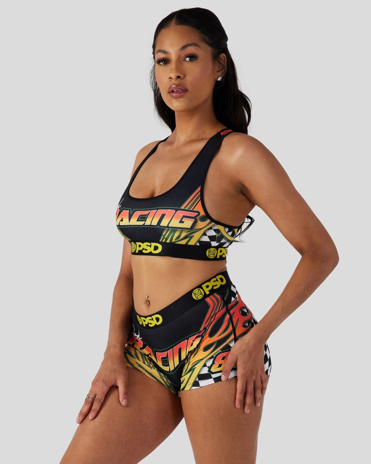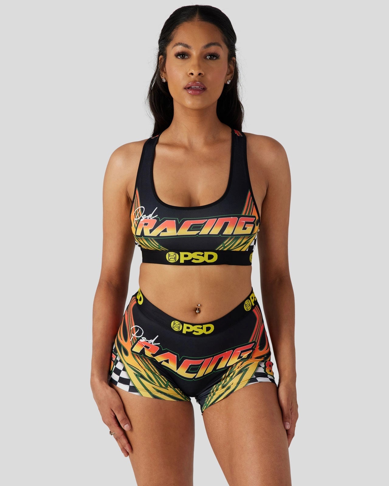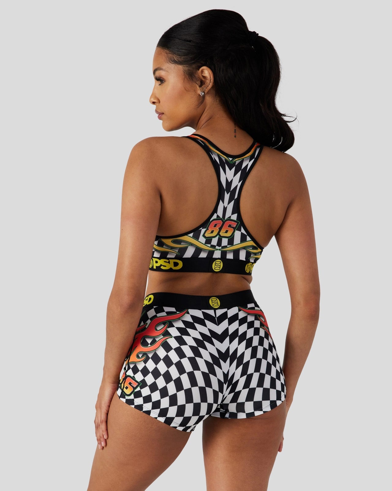 With an early 2000s NASCAR-inspired print that features checkers and racing flames. this new pair is sure to get your engine revving. The Thunder Road Sports Bra is made from a silky poly blend and is breathable yet slightly compressive. bringing you the comfort and support you need for everything you get into.